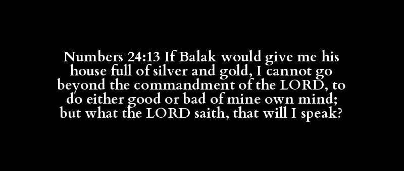 Numbers 24:13 If Balak would give me his house full of silver and gold, I cannot go beyond the commandment of the LORD, to do either good or bad of mine own mind; but what the LORD saith, that will I speak?