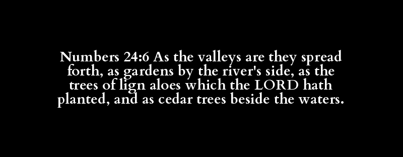 Numbers 24:6 As the valleys are they spread forth, as gardens by the river's side, as the trees of lign aloes which the LORD hath planted, and as cedar trees beside the waters.
