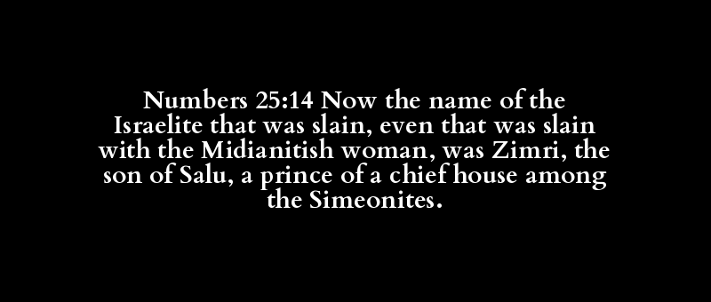 Numbers 25:14 Now the name of the Israelite that was slain, even that was slain with the Midianitish woman, was Zimri, the son of Salu, a prince of a chief house among the Simeonites.