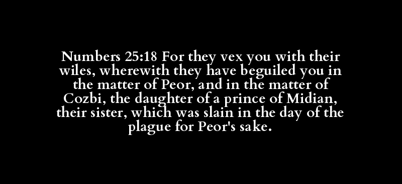 Numbers 25:18 For they vex you with their wiles, wherewith they have beguiled you in the matter of Peor, and in the matter of Cozbi, the daughter of a prince of Midian, their sister, which was slain in the day of the plague for Peor's sake.