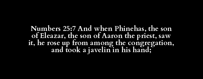 Numbers 25:7 And when Phinehas, the son of Eleazar, the son of Aaron the priest, saw it, he rose up from among the congregation, and took a javelin in his hand;