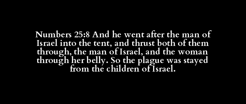 Numbers 25:8 And he went after the man of Israel into the tent, and thrust both of them through, the man of Israel, and the woman through her belly. So the plague was stayed from the children of Israel.