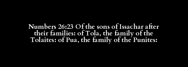 Numbers 26:23 Of the sons of Issachar after their families: of Tola, the family of the Tolaites: of Pua, the family of the Punites: