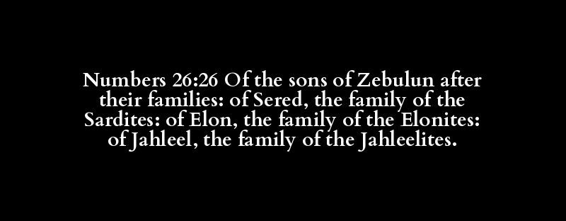 Numbers 26:26 Of the sons of Zebulun after their families: of Sered, the family of the Sardites: of Elon, the family of the Elonites: of Jahleel, the family of the Jahleelites.
