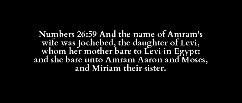 Numbers 26:59 And the name of Amram's wife was Jochebed, the daughter of Levi, whom her mother bare to Levi in Egypt: and she bare unto Amram Aaron and Moses, and Miriam their sister.