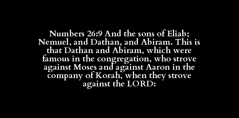 Numbers 26:9 And the sons of Eliab; Nemuel, and Dathan, and Abiram. This is that Dathan and Abiram, which were famous in the congregation, who strove against Moses and against Aaron in the company of Korah, when they strove against the LORD: