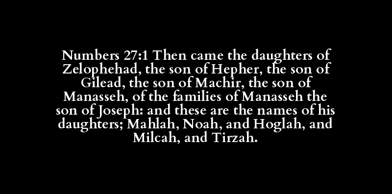 Numbers 27:1 Then came the daughters of Zelophehad, the son of Hepher, the son of Gilead, the son of Machir, the son of Manasseh, of the families of Manasseh the son of Joseph: and these are the names of his daughters; Mahlah, Noah, and Hoglah, and Milcah, and Tirzah.
