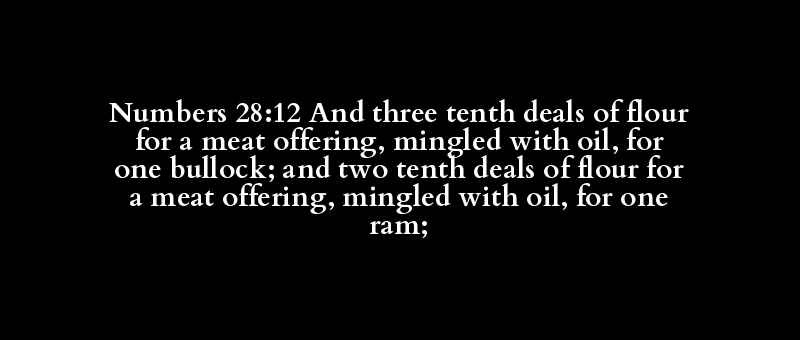 Numbers 28:12 And three tenth deals of flour for a meat offering, mingled with oil, for one bullock; and two tenth deals of flour for a meat offering, mingled with oil, for one ram;