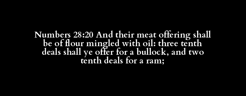 Numbers 28:20 And their meat offering shall be of flour mingled with oil: three tenth deals shall ye offer for a bullock, and two tenth deals for a ram;