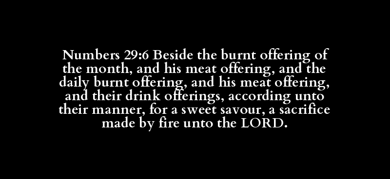 Numbers 29:6 Beside the burnt offering of the month, and his meat offering, and the daily burnt offering, and his meat offering, and their drink offerings, according unto their manner, for a sweet savour, a sacrifice made by fire unto the LORD.