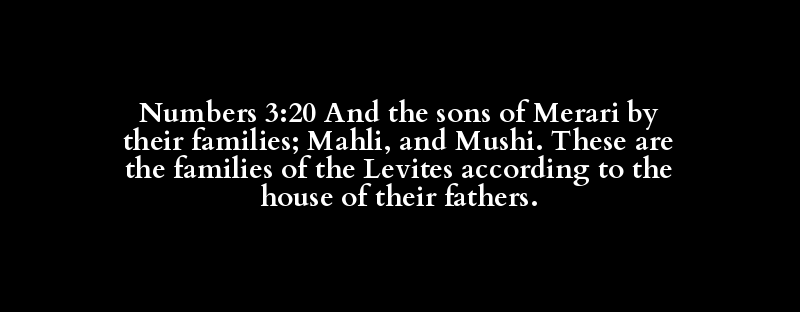 Numbers 3:20 And the sons of Merari by their families; Mahli, and Mushi. These are the families of the Levites according to the house of their fathers.
