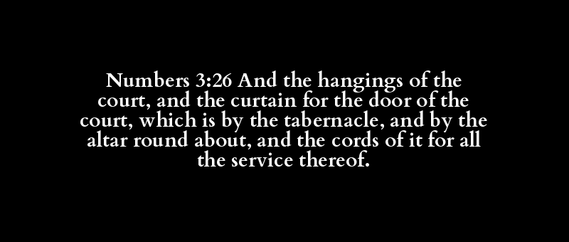 Numbers 3:26 And the hangings of the court, and the curtain for the door of the court, which is by the tabernacle, and by the altar round about, and the cords of it for all the service thereof.