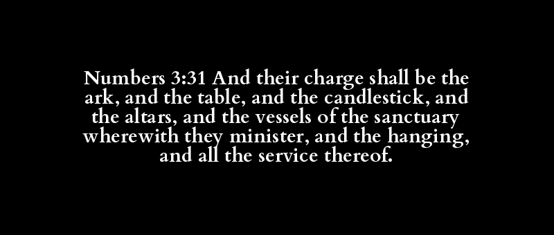 Numbers 3:31 And their charge shall be the ark, and the table, and the candlestick, and the altars, and the vessels of the sanctuary wherewith they minister, and the hanging, and all the service thereof.