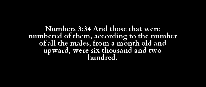 Numbers 3:34 And those that were numbered of them, according to the number of all the males, from a month old and upward, were six thousand and two hundred.