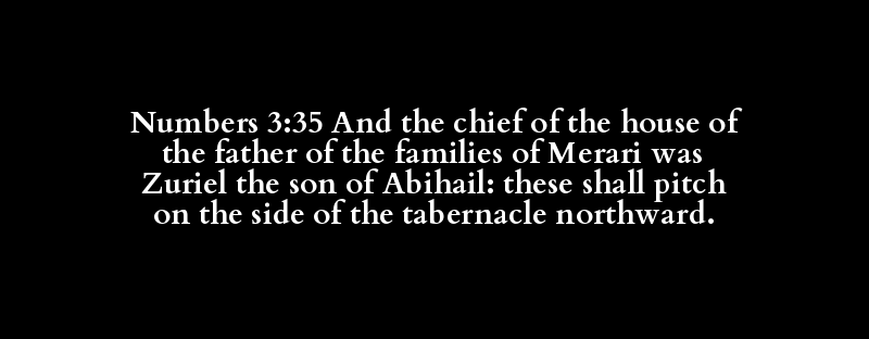 Numbers 3:35 And the chief of the house of the father of the families of Merari was Zuriel the son of Abihail: these shall pitch on the side of the tabernacle northward.