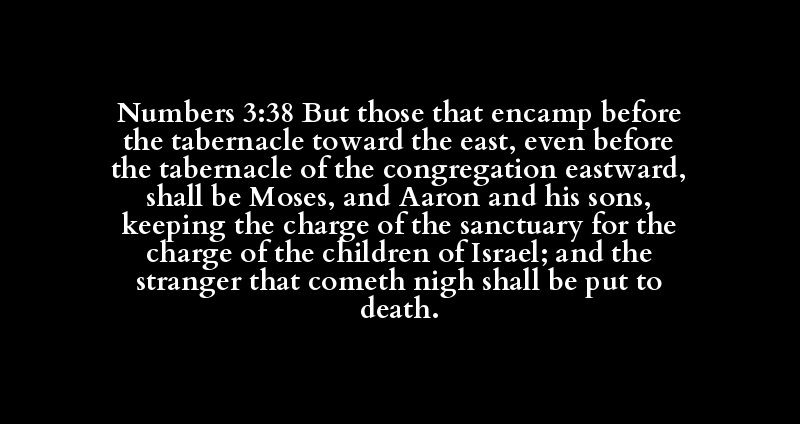 Numbers 3:38 But those that encamp before the tabernacle toward the east, even before the tabernacle of the congregation eastward, shall be Moses, and Aaron and his sons, keeping the charge of the sanctuary for the charge of the children of Israel; and the stranger that cometh nigh shall be put to death.