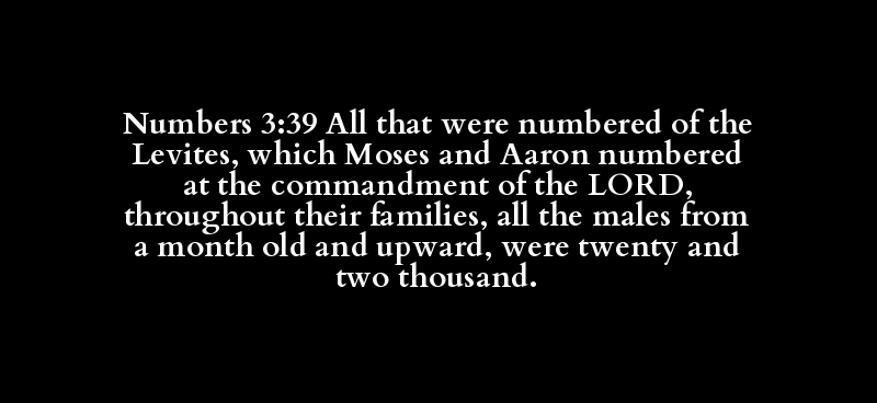 Numbers 3:39 All that were numbered of the Levites, which Moses and Aaron numbered at the commandment of the LORD, throughout their families, all the males from a month old and upward, were twenty and two thousand.