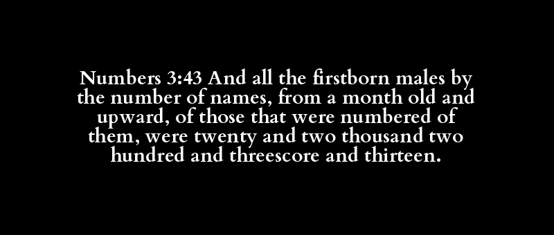 Numbers 3:43 And all the firstborn males by the number of names, from a month old and upward, of those that were numbered of them, were twenty and two thousand two hundred and threescore and thirteen.