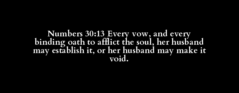 Numbers 30:13 Every vow, and every binding oath to afflict the soul, her husband may establish it, or her husband may make it void.