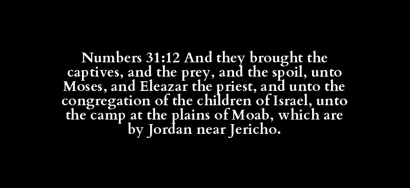 Numbers 31:12 And they brought the captives, and the prey, and the spoil, unto Moses, and Eleazar the priest, and unto the congregation of the children of Israel, unto the camp at the plains of Moab, which are by Jordan near Jericho.