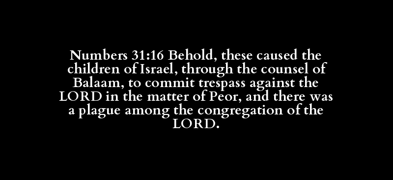 Numbers 31:16 Behold, these caused the children of Israel, through the counsel of Balaam, to commit trespass against the LORD in the matter of Peor, and there was a plague among the congregation of the LORD.
