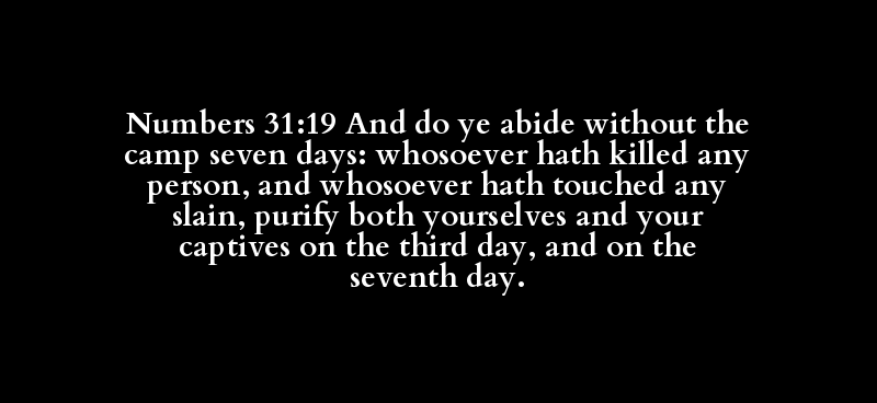 Numbers 31:19 And do ye abide without the camp seven days: whosoever hath killed any person, and whosoever hath touched any slain, purify both yourselves and your captives on the third day, and on the seventh day.