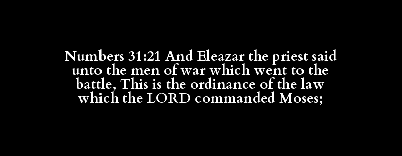 Numbers 31:21 And Eleazar the priest said unto the men of war which went to the battle, This is the ordinance of the law which the LORD commanded Moses;