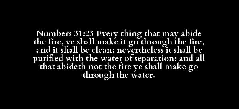 Numbers 31:23 Every thing that may abide the fire, ye shall make it go through the fire, and it shall be clean: nevertheless it shall be purified with the water of separation: and all that abideth not the fire ye shall make go through the water.