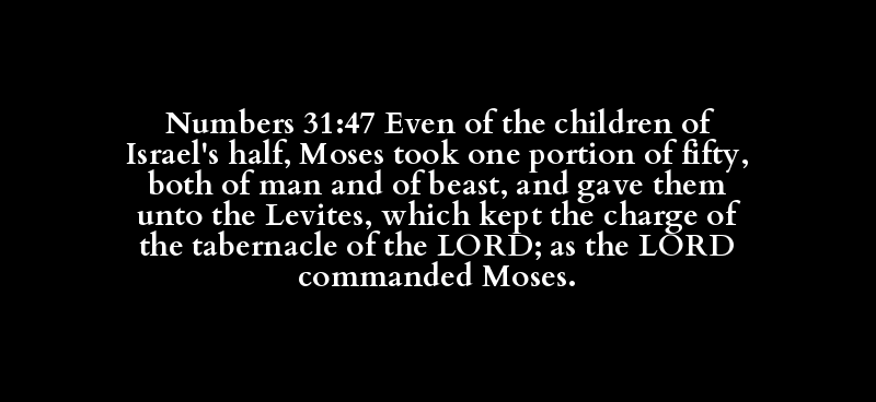 Numbers 31:47 Even of the children of Israel's half, Moses took one portion of fifty, both of man and of beast, and gave them unto the Levites, which kept the charge of the tabernacle of the LORD; as the LORD commanded Moses.
