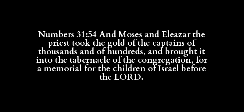 Numbers 31:54 And Moses and Eleazar the priest took the gold of the captains of thousands and of hundreds, and brought it into the tabernacle of the congregation, for a memorial for the children of Israel before the LORD.