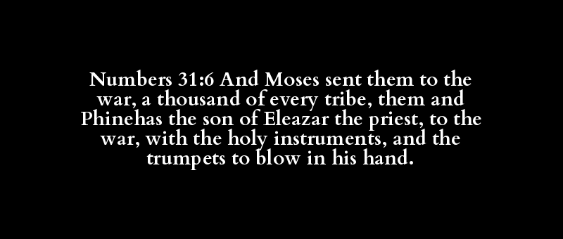 Numbers 31:6 And Moses sent them to the war, a thousand of every tribe, them and Phinehas the son of Eleazar the priest, to the war, with the holy instruments, and the trumpets to blow in his hand.