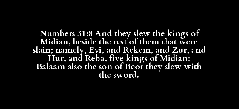 Numbers 31:8 And they slew the kings of Midian, beside the rest of them that were slain; namely, Evi, and Rekem, and Zur, and Hur, and Reba, five kings of Midian: Balaam also the son of Beor they slew with the sword.