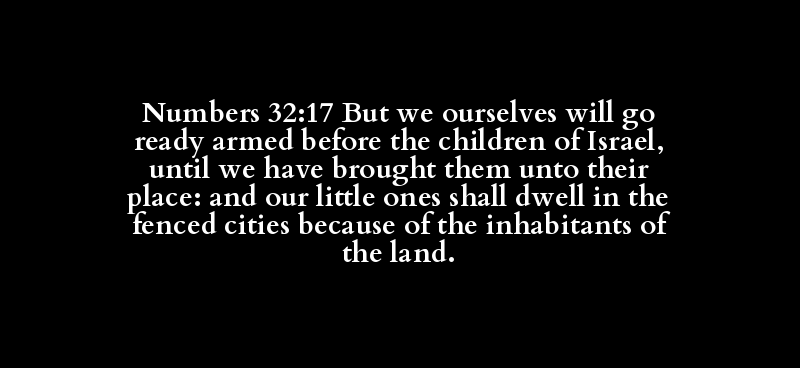 Numbers 32:17 But we ourselves will go ready armed before the children of Israel, until we have brought them unto their place: and our little ones shall dwell in the fenced cities because of the inhabitants of the land.
