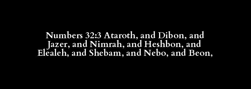 Numbers 32:3 Ataroth, and Dibon, and Jazer, and Nimrah, and Heshbon, and Elealeh, and Shebam, and Nebo, and Beon,
