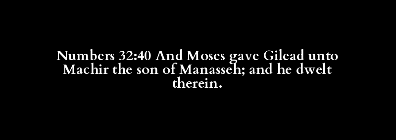 Numbers 32:40 And Moses gave Gilead unto Machir the son of Manasseh; and he dwelt therein.