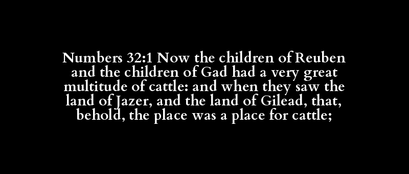 Numbers 32:1 Now the children of Reuben and the children of Gad had a very great multitude of cattle: and when they saw the land of Jazer, and the land of Gilead, that, behold, the place was a place for cattle;