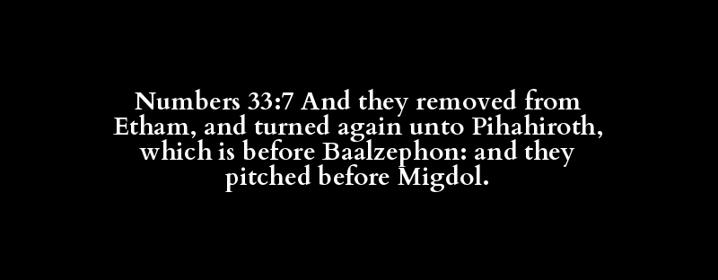 Numbers 33:7 And they removed from Etham, and turned again unto Pihahiroth, which is before Baalzephon: and they pitched before Migdol.