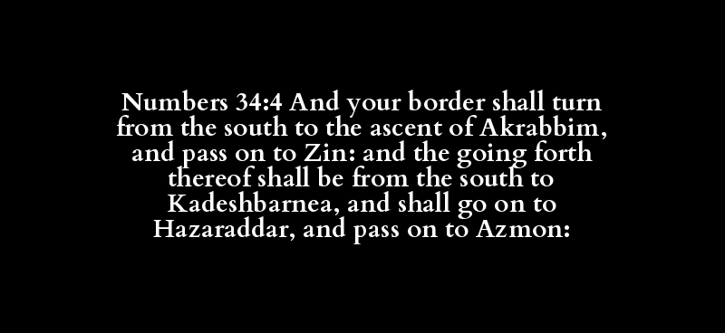 Numbers 34:4 And your border shall turn from the south to the ascent of Akrabbim, and pass on to Zin: and the going forth thereof shall be from the south to Kadeshbarnea, and shall go on to Hazaraddar, and pass on to Azmon: