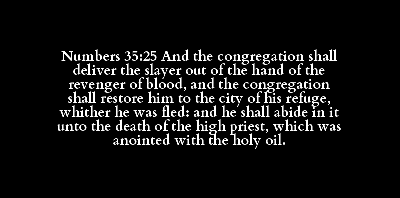 Numbers 35:25 And the congregation shall deliver the slayer out of the hand of the revenger of blood, and the congregation shall restore him to the city of his refuge, whither he was fled: and he shall abide in it unto the death of the high priest, which was anointed with the holy oil.