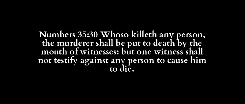 Numbers 35:30 Whoso killeth any person, the murderer shall be put to death by the mouth of witnesses: but one witness shall not testify against any person to cause him to die.