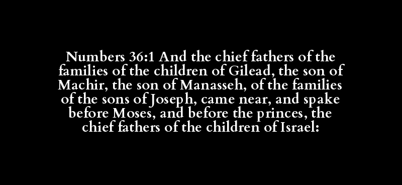 Numbers 36:1 And the chief fathers of the families of the children of Gilead, the son of Machir, the son of Manasseh, of the families of the sons of Joseph, came near, and spake before Moses, and before the princes, the chief fathers of the children of Israel: