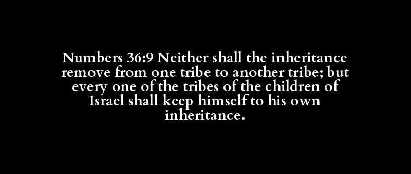 Numbers 36:9 Neither shall the inheritance remove from one tribe to another tribe; but every one of the tribes of the children of Israel shall keep himself to his own inheritance.