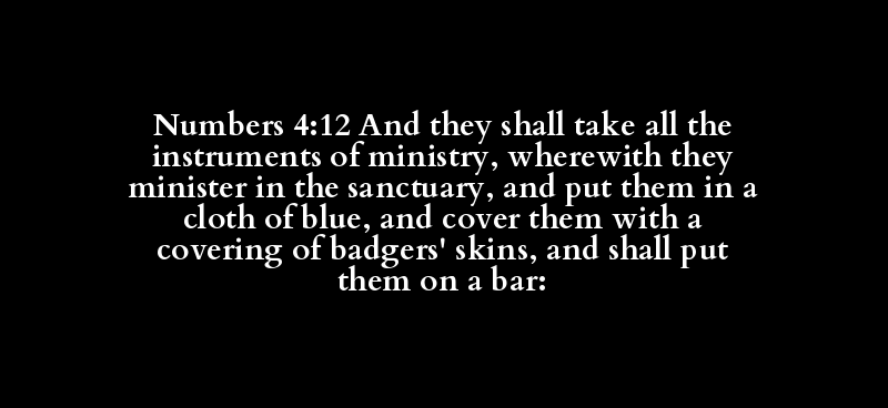 Numbers 4:12 And they shall take all the instruments of ministry, wherewith they minister in the sanctuary, and put them in a cloth of blue, and cover them with a covering of badgers' skins, and shall put them on a bar: