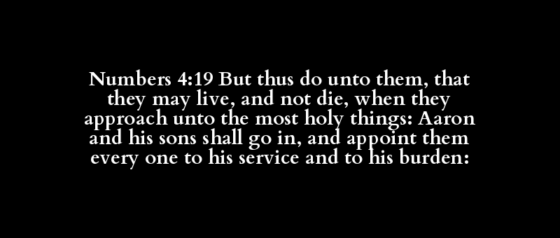 Numbers 4:19 But thus do unto them, that they may live, and not die, when they approach unto the most holy things: Aaron and his sons shall go in, and appoint them every one to his service and to his burden: