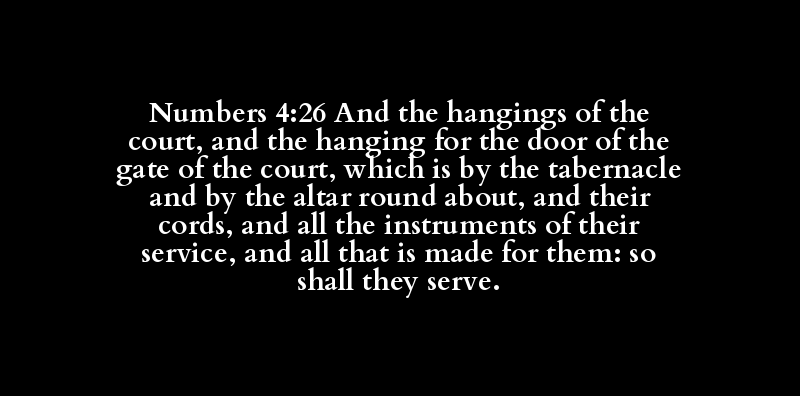 Numbers 4:26 And the hangings of the court, and the hanging for the door of the gate of the court, which is by the tabernacle and by the altar round about, and their cords, and all the instruments of their service, and all that is made for them: so shall they serve.