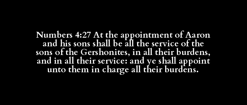 Numbers 4:27 At the appointment of Aaron and his sons shall be all the service of the sons of the Gershonites, in all their burdens, and in all their service: and ye shall appoint unto them in charge all their burdens.