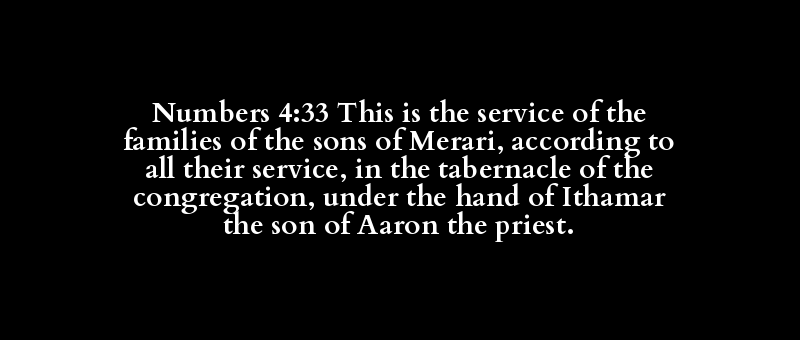 Numbers 4:33 This is the service of the families of the sons of Merari, according to all their service, in the tabernacle of the congregation, under the hand of Ithamar the son of Aaron the priest.