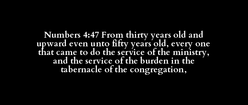 Numbers 4:47 From thirty years old and upward even unto fifty years old, every one that came to do the service of the ministry, and the service of the burden in the tabernacle of the congregation,