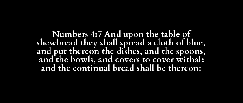 Numbers 4:7 And upon the table of shewbread they shall spread a cloth of blue, and put thereon the dishes, and the spoons, and the bowls, and covers to cover withal: and the continual bread shall be thereon: