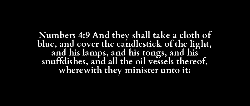 Numbers 4:9 And they shall take a cloth of blue, and cover the candlestick of the light, and his lamps, and his tongs, and his snuffdishes, and all the oil vessels thereof, wherewith they minister unto it: